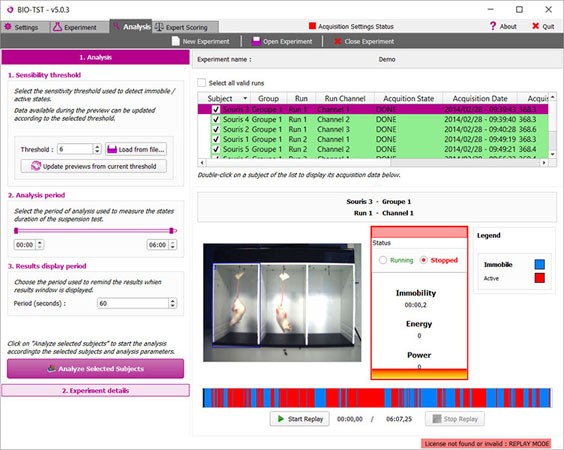 The measuring principle is based on the quantity of movements that a mouse trying to escape from its suspension can generate. During the Tail Suspension Test, the movements of the mice are analyzed in terms of activity (active/non active), energy and power developed over time. As human observation is time consuming and tedious, Bioseb's Tail Suspension Test (TST) automates the entire experiment.