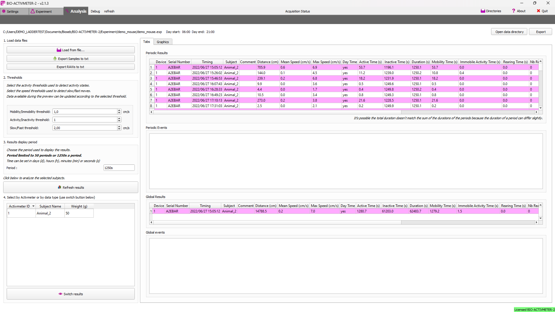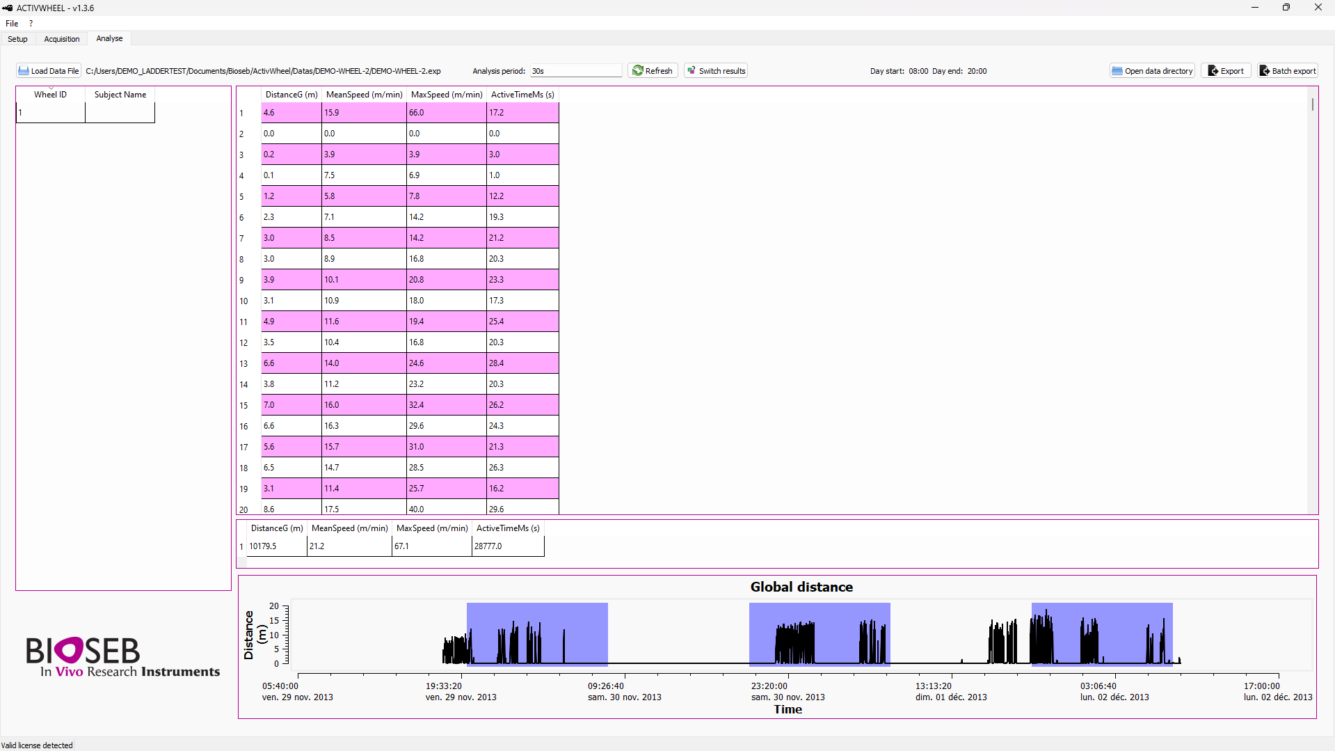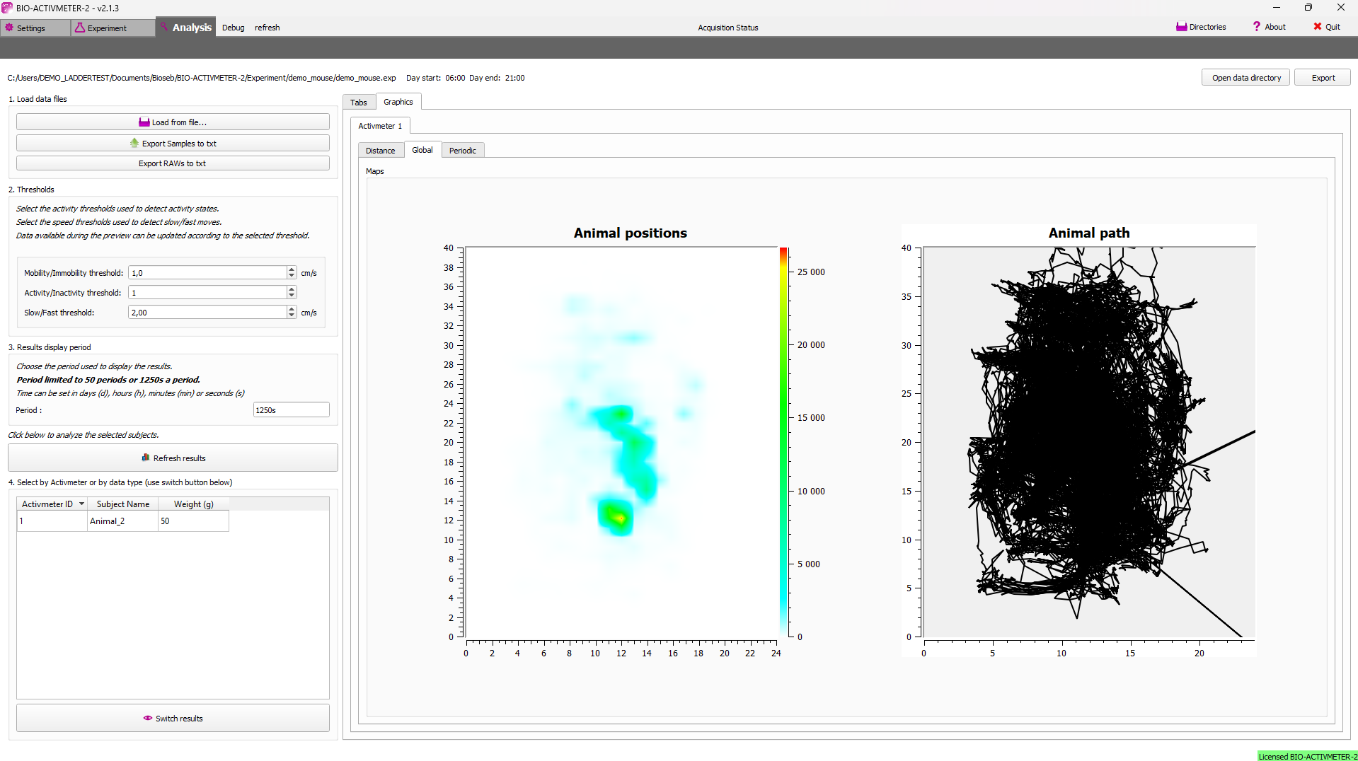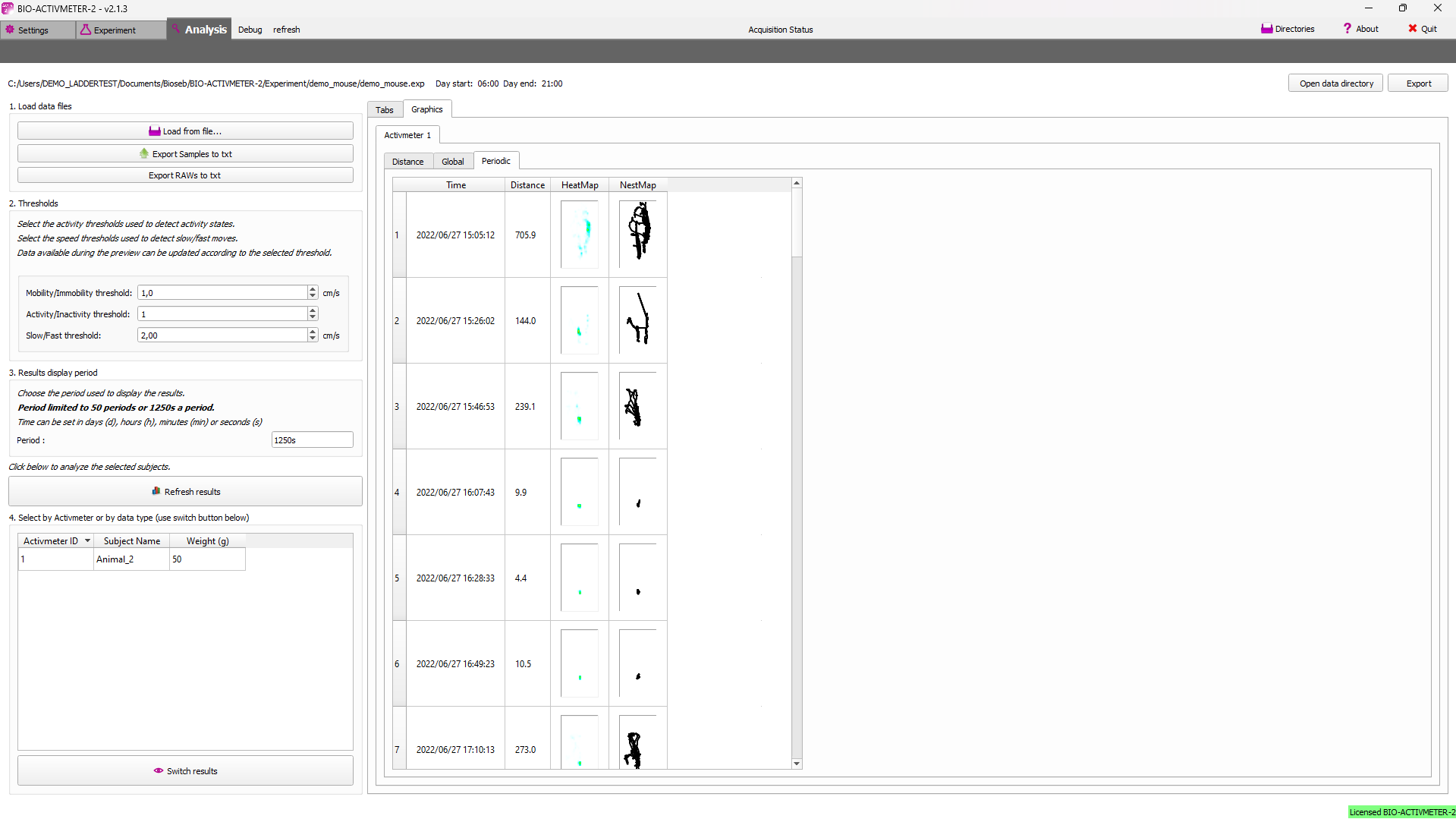 Using Bioseb's ACTIVMETER software, the operator of the actometer can define his own immobility standard as well as the thresholds between slow motion and fast motion. During the actimetry experiment, the operator can visualize on the screen the real-time activity type, position and motion, as well as the parameters measured during each sampling period for each animal (mouse or rat). The operator can also mark special behaviour types using a notepad application and keyboard shortcuts (ethological keyboard). Raw acquisition data files are stored in a proprietary format, while a .txt version can be used for further activity analysis.