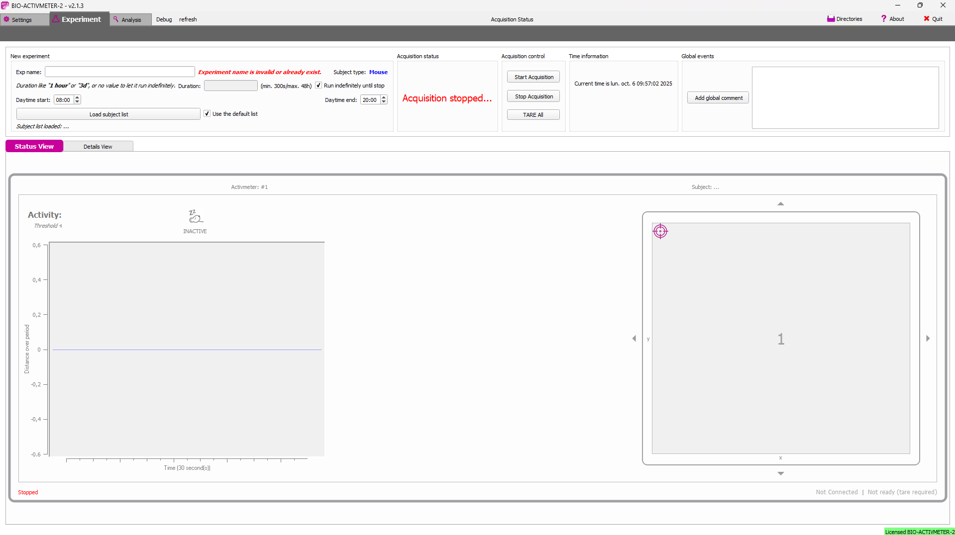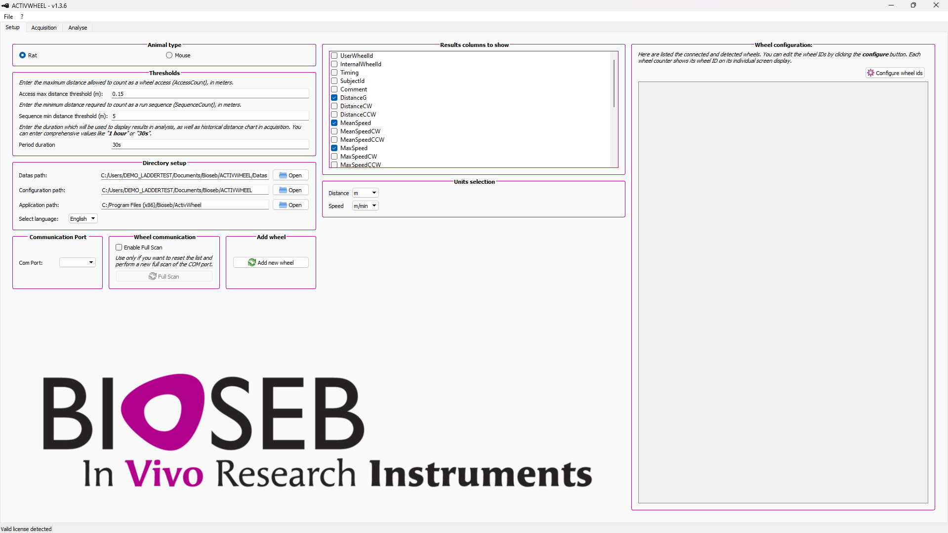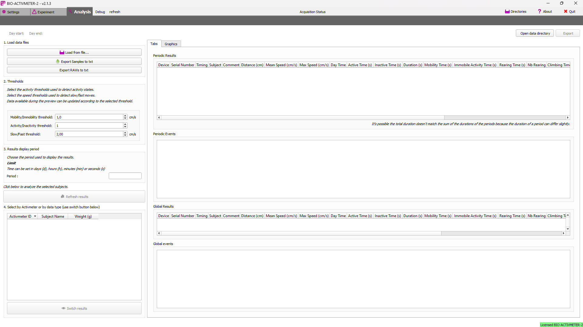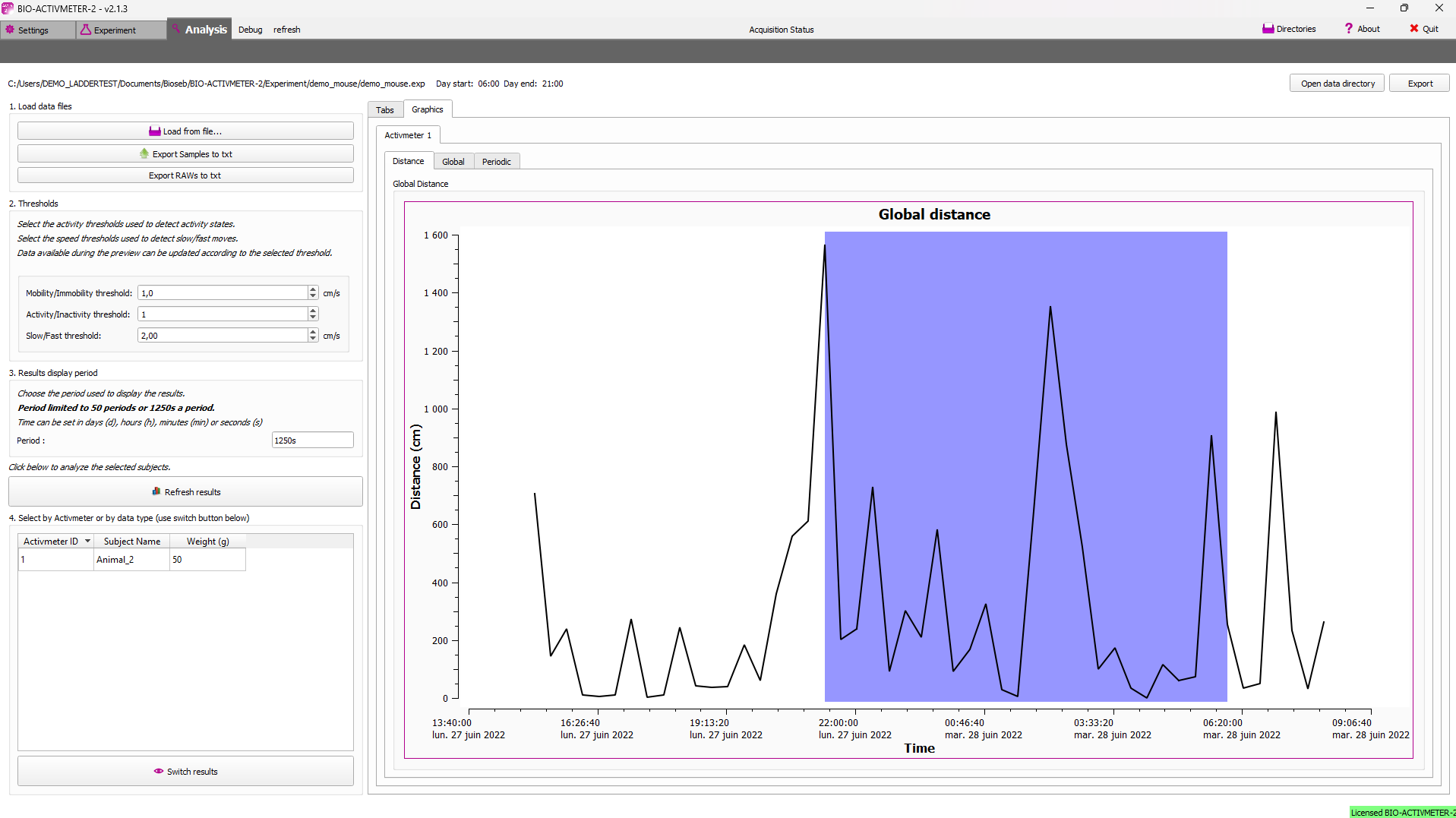 Using Bioseb's ACTIVMETER software, the operator of the actometer can define his own immobility standard as well as the thresholds between slow motion and fast motion. During the actimetry experiment, the operator can visualize on the screen the real-time activity type, position and motion, as well as the parameters measured during each sampling period for each animal (mouse or rat). The operator can also mark special behaviour types using a notepad application and keyboard shortcuts (ethological keyboard). Raw acquisition data files are stored in a proprietary format, while a .txt version can be used for further activity analysis.