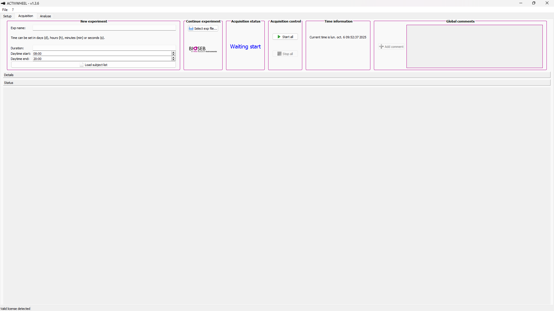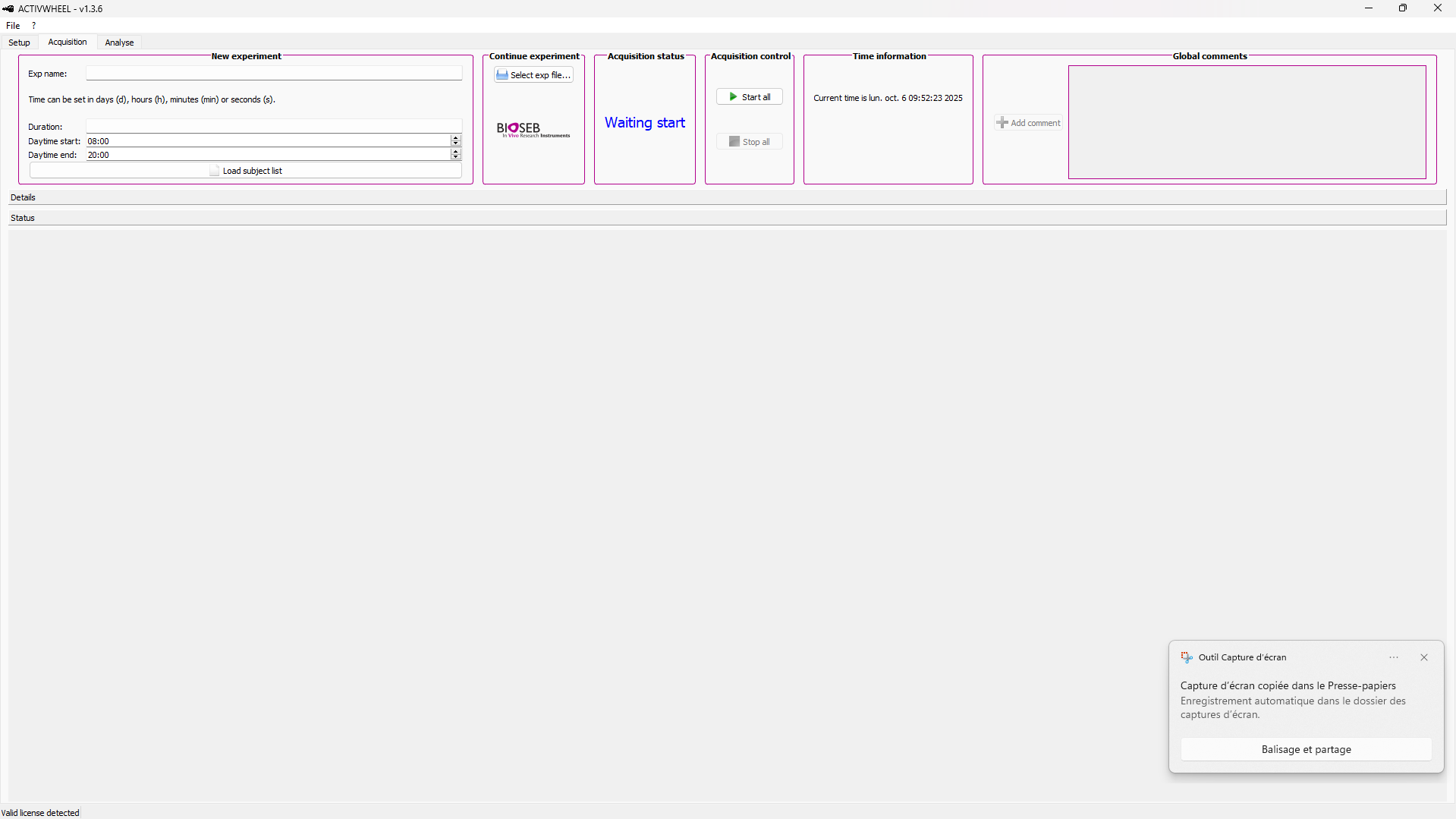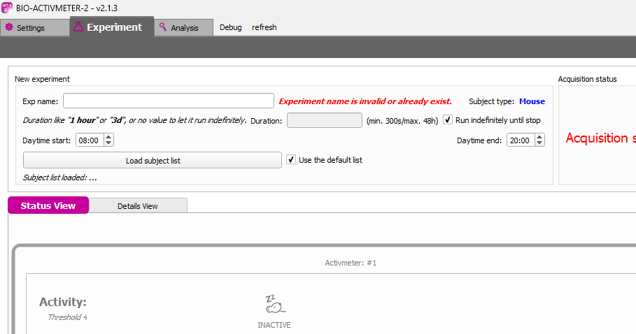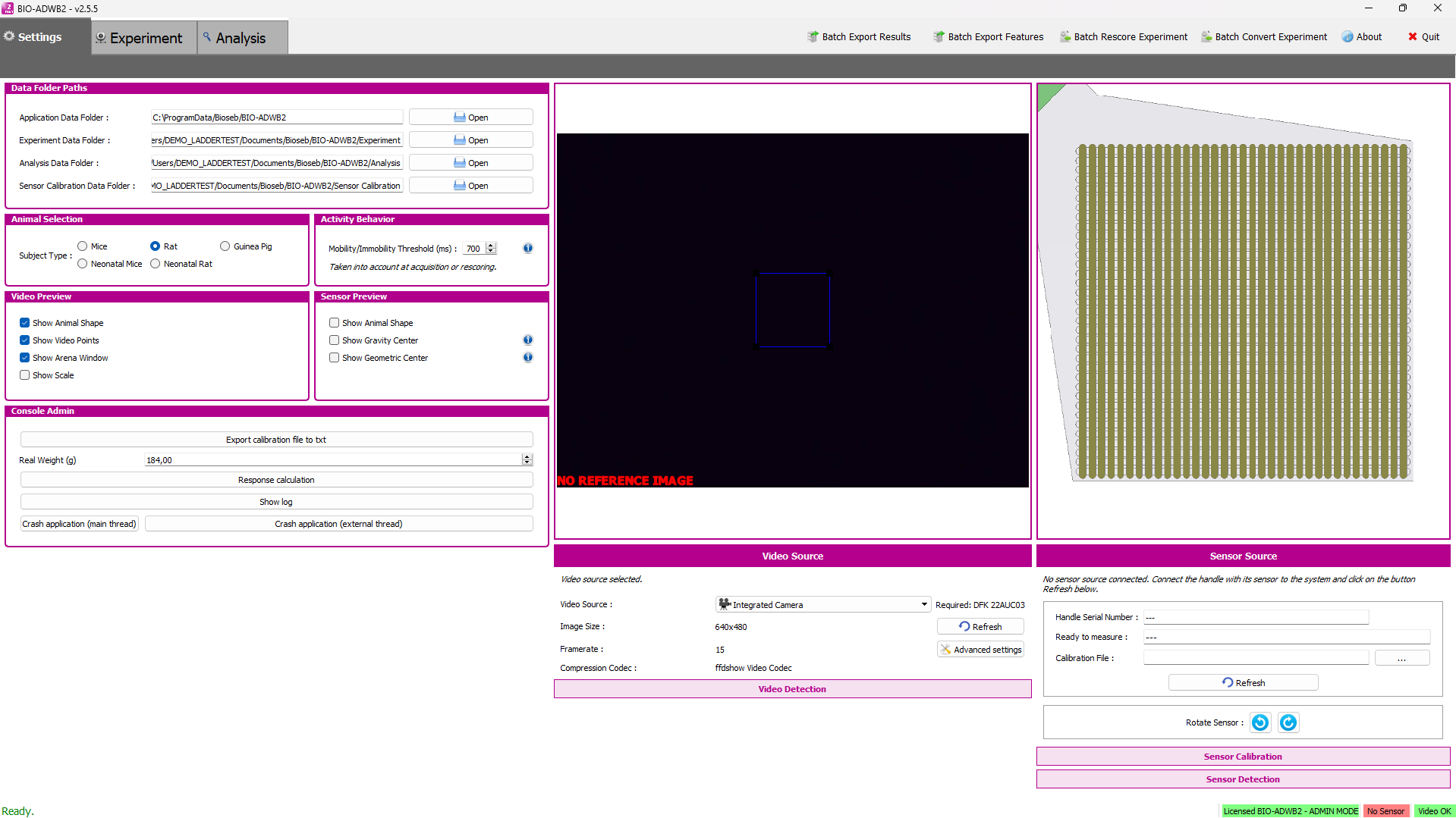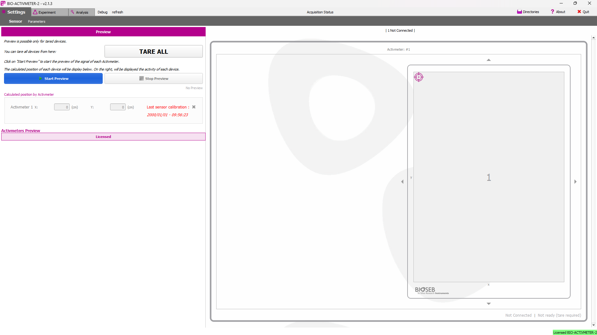 Using Bioseb's ACTIVMETER software, the operator of the actometer can define his own immobility standard as well as the thresholds between slow motion and fast motion. During the actimetry experiment, the operator can visualize on the screen the real-time activity type, position and motion, as well as the parameters measured during each sampling period for each animal (mouse or rat). The operator can also mark special behaviour types using a notepad application and keyboard shortcuts (ethological keyboard). Raw acquisition data files are stored in a proprietary format, while a .txt version can be used for further activity analysis.