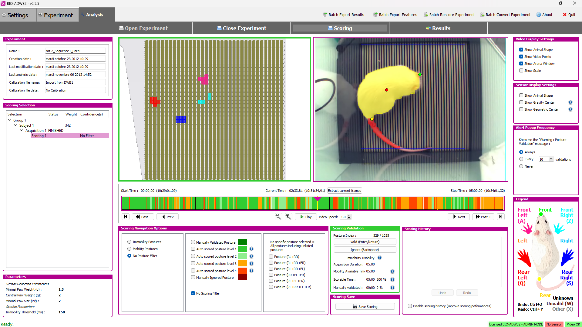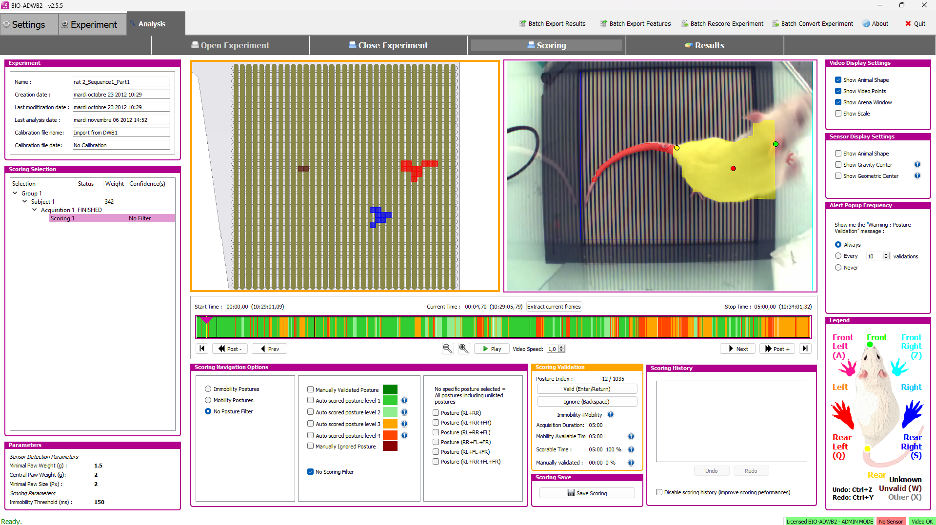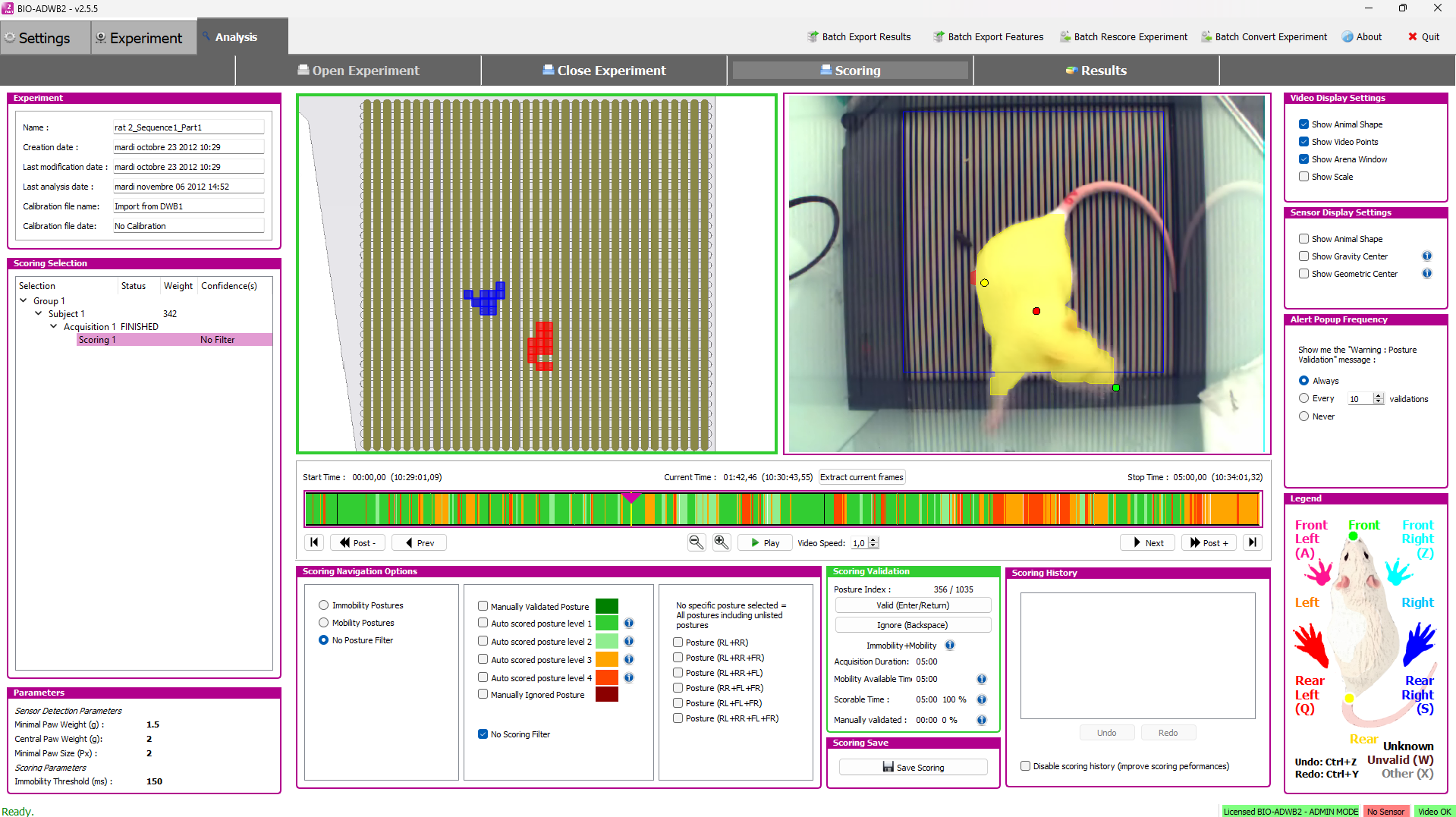 The latest version of our Dynamic Weight Bearing Test (DWB2). Results are presented as in the manual version but with a brand new and improved interface, increased acquisition rates, better automatic scoring, complex experiments and results management and still downward compatible with your DWB1 data. Software presents the weight distribution of the animal (rat or mouse), per limb, with additional ratio computations and filtering options.