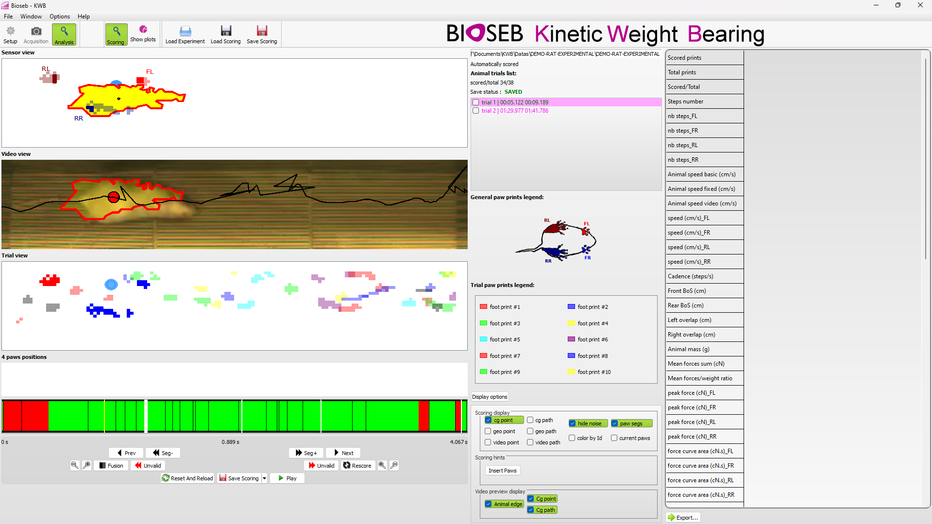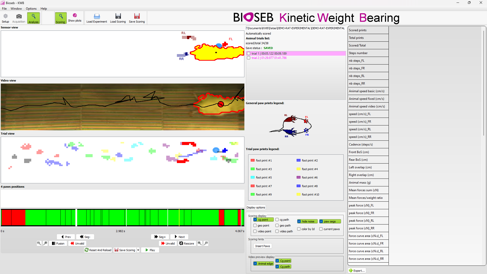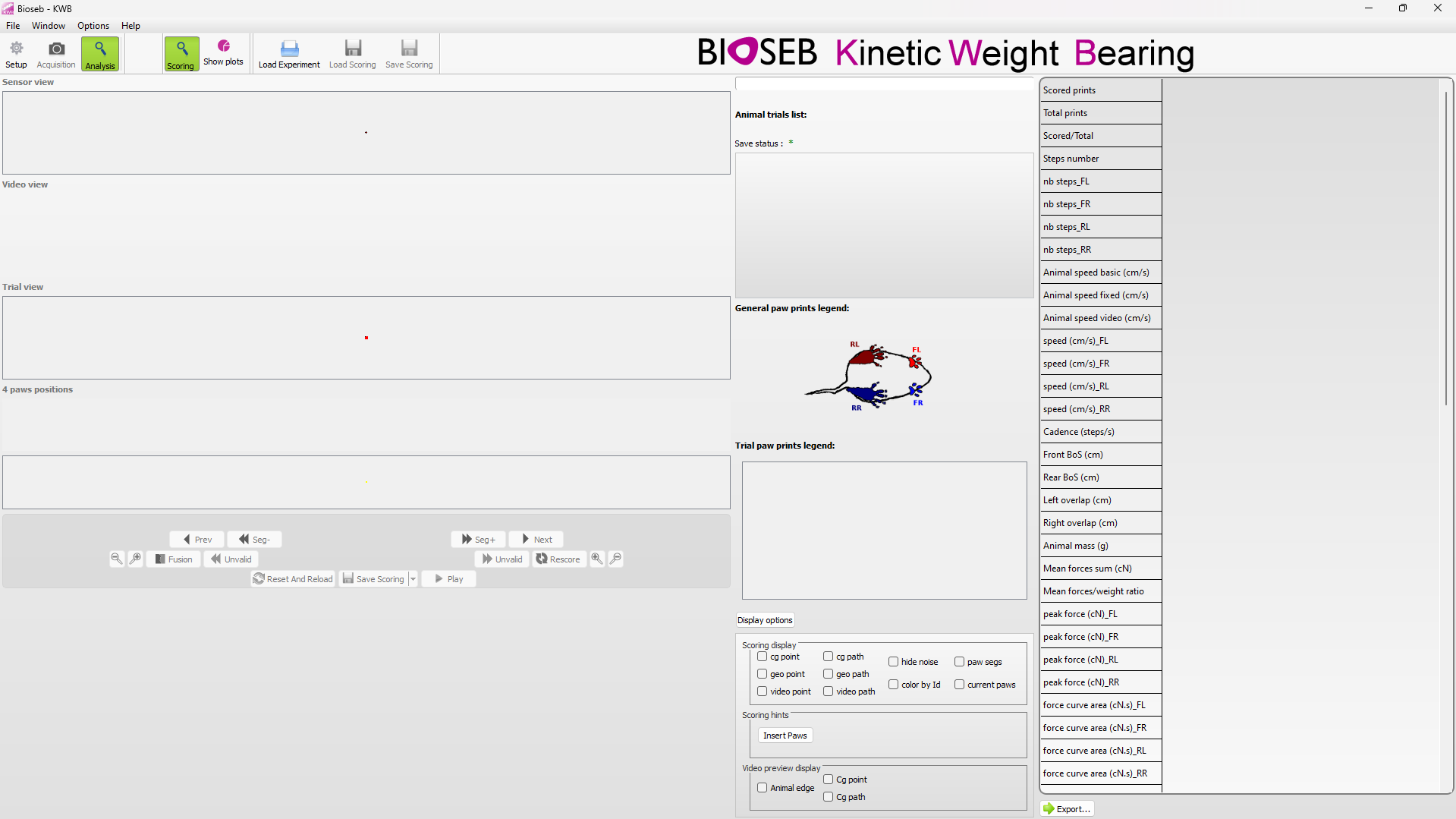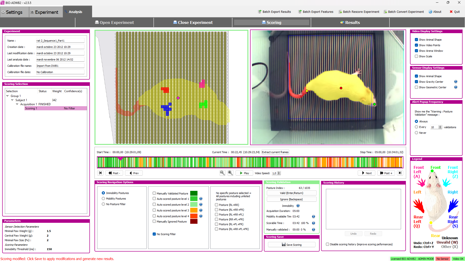 The latest version of our Dynamic Weight Bearing Test (DWB2). Results are presented as in the manual version but with a brand new and improved interface, increased acquisition rates, better automatic scoring, complex experiments and results management and still downward compatible with your DWB1 data. Software presents the weight distribution of the animal (rat or mouse), per limb, with additional ratio computations and filtering options.