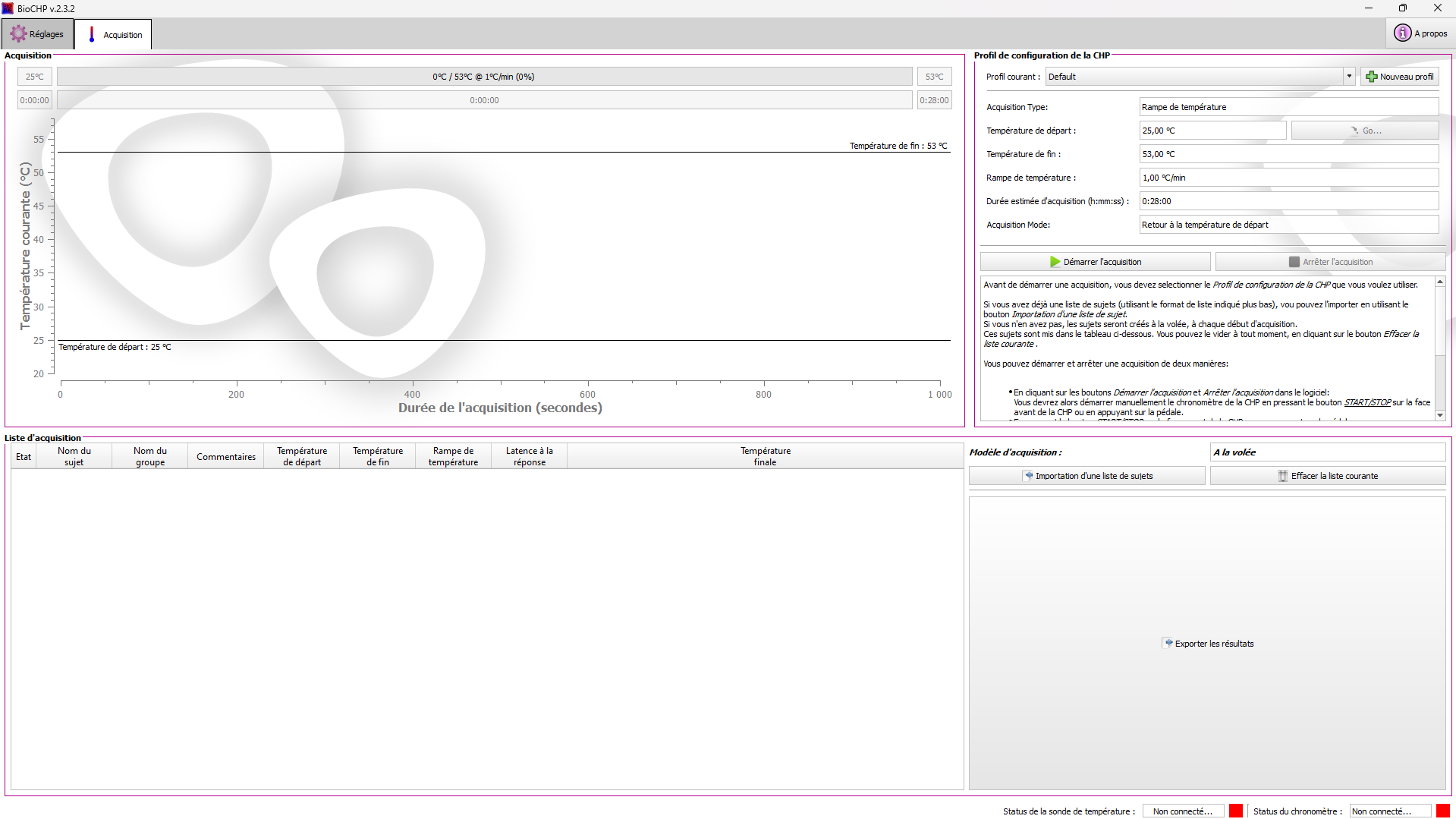 The Cold Hot Plate Test Analgesia Meter can be complemented by a software allowing for temperature "ramps" and “loops”, predefined by the user. This feature is mainly used for studies with telemetry implants. In addition to displaying the reaction time, the Cold/Hot Plate Analgesia Meter is able to send the same information via USB interface to a computer. Note: For Windows 8 (32/64 bits), Bioseb's Cold Hot Plate CHP software must be installed and run in Administrator mode.