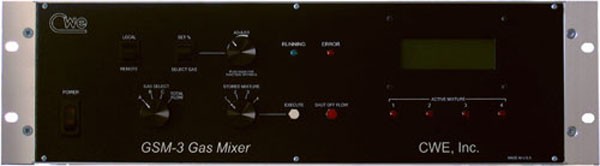The GSM-3 Gas Mixer is a versatile and accurate device for creating custom respiratory gas mixtures. Any three gasses can be connected as inputs, and the output is the userprogrammed mixture of these gasses. The instrument can operate in a stand-alone mode, with mixture programming done from the front panel controls, or it can be controlled using an attached computer running the supplied software.Besides the mixing function, the GSM-3 can operate as an accurate flow source for a single gas.