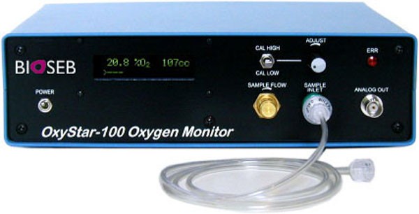 The OxyStar-100 is a fast-response, high accuracy oxygen analyzer for respiratory monitoring, hypoxic gas studies, or general laboratory use. It features a measurement range of 0 - 100% O2, with a resolution of 0.1%. Sample flow is adjustable over a 10 - 200ml/min range, making respiratory oxygen measurements possible on small as well as larger animals and human subjects.