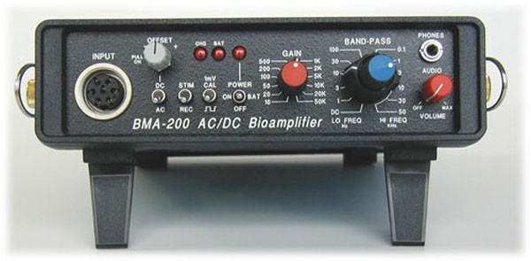 The BMA-200 features a wide gain range, sharp cutoff bandpass filters, an AC calibrator, and a built-in audioamplifier and speaker for monitoring the signal. Stimulus delivery to the electrodes is accomplished by a front-panel switch, or via an external logic signal. True DC response is switch-selectable, with a variable DC offset control. Low-power circuitry contributes to long operating time between charges, or the unit can be operated continuously with the included AC adapter. It can be used as a stable DC amplifier, and includes adjustable DC input offset controls.