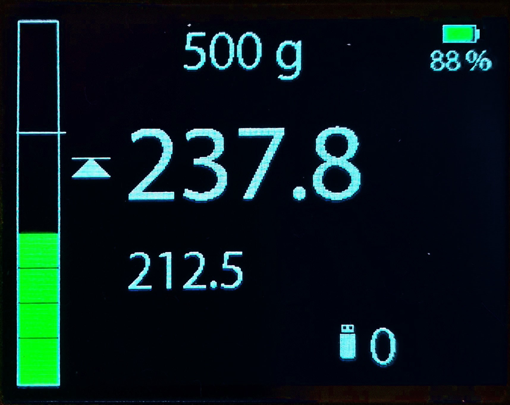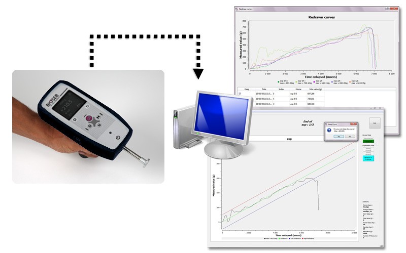 Les mesures peuvent être enregistrées et affichées en grammes, en Newtons, ou en livres - l'unité étant sélectionnée automatiquement sur le clavier. Les données peuvent être exportées via le port RS232 vers une imprimante ou un enregistreur graphique. Les mesures individuelles (jusqu'à 100 mesures) sont stockées dans une mémoire interne, et peuvent être téléchargées après l'expérience.