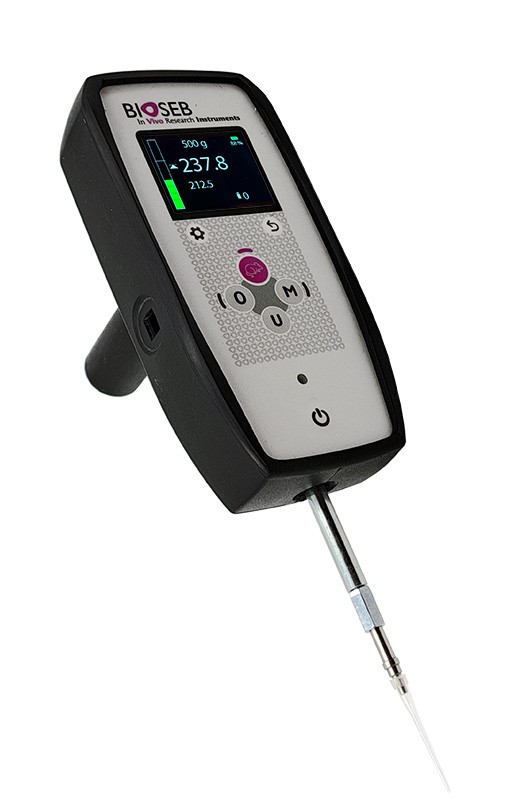 Les filaments de Von Frey sont couramment utilisés pour quantifier la douleur ou évaluer la sensibilité, mais cette technique demande beaucoup de temps et ne permet pas d'éviter les contaminations croisées - de plus, elle est limitée à des forces de 300 grammes. La pleine capacité de notre algomètre à pression étant de 5000 grammes (soit 50N), l'instrument permet des mesures de seuil de douleur pour la plupart des gros mammifères.